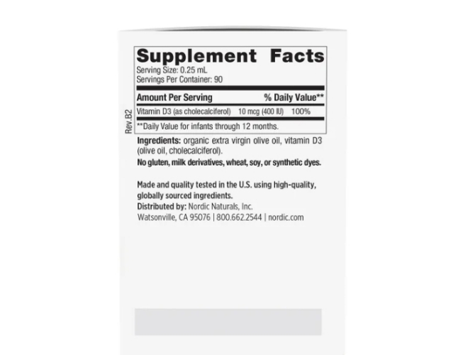 1회 섭취량: 0.25 mL (400 IU 또는 10 mcg의 비타민 D3 함유)